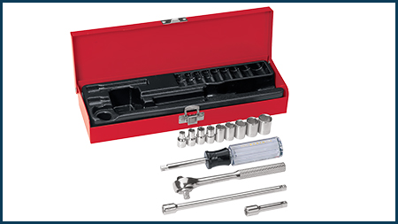 Viene con nueve dados de 6 puntas: Incluye llaves de 3/16'' (2 mm), 7/32'' (2,4 mm), 1/4'' (2,8 mm), 9/32'' (3,2 mm), 5/16'' (3,6 mm), 11/32'' (4 mm), 3/8'' (4,8 mm), 7/16'' (5,6 mm) y 1/2'' (6,3 mm) Incluye un mango rotativo y una matraca. Dos extensiones de 2'' y 6'' (51 mm y 152 mm) de largo. La caja metálica con bisagra mantiene todas las piezas en un solo lugar.