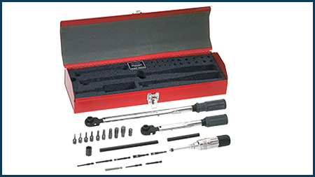 Una llave de torsión ajustable micrométrica de 7/16'', hexagonal en la parte interna. Rango de torsión: 200 lb in a 1200 lb in (22,6 Nm a 135,6 Nm) en incrementos de 10 lb in (1,1 Nm). Una llave de torsión ajustable micrométrica de 7/16'', hexagonal en la parte interna. Rango de torsión: 40 lb in a 200 lb in (4,5 Nm a 22,6 Nm) en incrementos de 2 lb in (0,2 Nm). Diez brocas para llave de 7/16''. Tamaños: 1/8'', 5/32'', 3/16'', 7/32'', 1/4'', 5/16'', 3/8'', 1/2'', 9/16'' y adaptador de hexagonal a cuadrado. Dos extensiones para llave hexagonal de 7/16''. Tamaños: 4'' (102 mm); 7'' (178 mm). Un adaptador (acoplador) para llave hexagonal hembra de 7/16''. Acopla la broca para llave a la extensión. Un adaptador de 1/4'' (6 mm) para desarmadores. Desarmador de torsión ajustable. Rango de torsión: 2 lb in a 36 lb in (0,2 Nm a 4 Nm) en incrementos de 2 lb in (0,2 Nm). Acepta brocas de 1/4''. 7 brocas p/desar. de 1/4''. Tamaños: 1/16'' × 0,034'' (n.º 4); 7/32'' × 0,036'' (n.º 5); 1/4'' × 0,038'' (n.º 6), 5/16'' × 0,046'' (n.º 10), 3/8'' × 0,050'' (n.º 12), Phillips n.º 1, Phillips n.º 2. La caja de metal con bisagras tipo piano incluye cerrojo con candado y mango. Desarmadores de torsión adicional disponibles en la sección de desarmadores.
